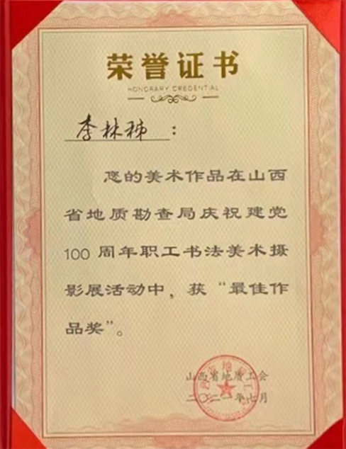 該作品曾在6月底地勘局舉辦的《地勘系統(tǒng)慶祝建黨100周年職工書法、美術(shù)、攝影展》中,獲得“最佳作品獎(jiǎng)”,同時(shí)入選《山西省地質(zhì)勘查局職工書法美術(shù)攝影展優(yōu)秀作品集》。