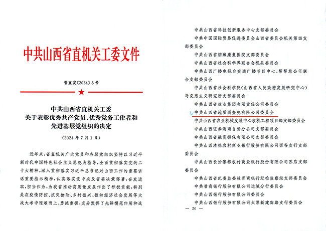 在慶祝中國共產(chǎn)黨成立103周年之際,省直機(jī)關(guān)工委下發(fā)了表彰省直機(jī)關(guān)優(yōu)秀共產(chǎn)黨員、優(yōu)秀黨務(wù)工作者和先進(jìn)基層黨組織的決定,中共山西省地質(zhì)調(diào)查院有限公司委員會獲評“先進(jìn)基層黨組織”稱號。