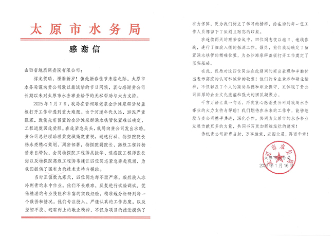 1月16日,山西省地質(zhì)調(diào)查院有限公司收到了來自太原市水務(wù)局的感謝信。信中,市水務(wù)局對我公司工作人員的敬業(yè)精神和專業(yè)素養(yǎng)給予高度認(rèn)可和贊賞,并對我公司長期以來對太原市水務(wù)事業(yè)的無私幫助與大力支持表達(dá)衷心感謝。
